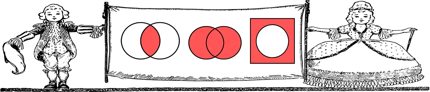 Każde z działań algebry ma ściśle określone właściwości. Matematycy lubią je ilustrować za pomocą diagramów Venna, czyli kół, zazwyczaj w jakimś stopniu się pokrywających, których część wspólna obrazuje wynik danej operacji.