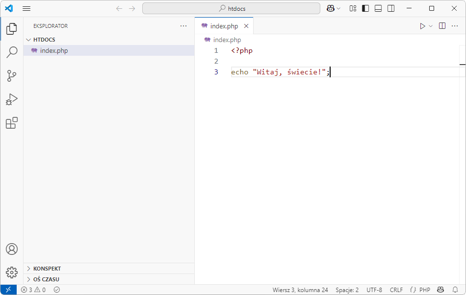 Teraz kliknij ikonę kartki ze znakiem plus w prawym górnym rogu okienka Eksploratora w Visual Studio Code i utwórz nowy plik o nazwie index.php. W pliku tym wpisz poniższy kod: