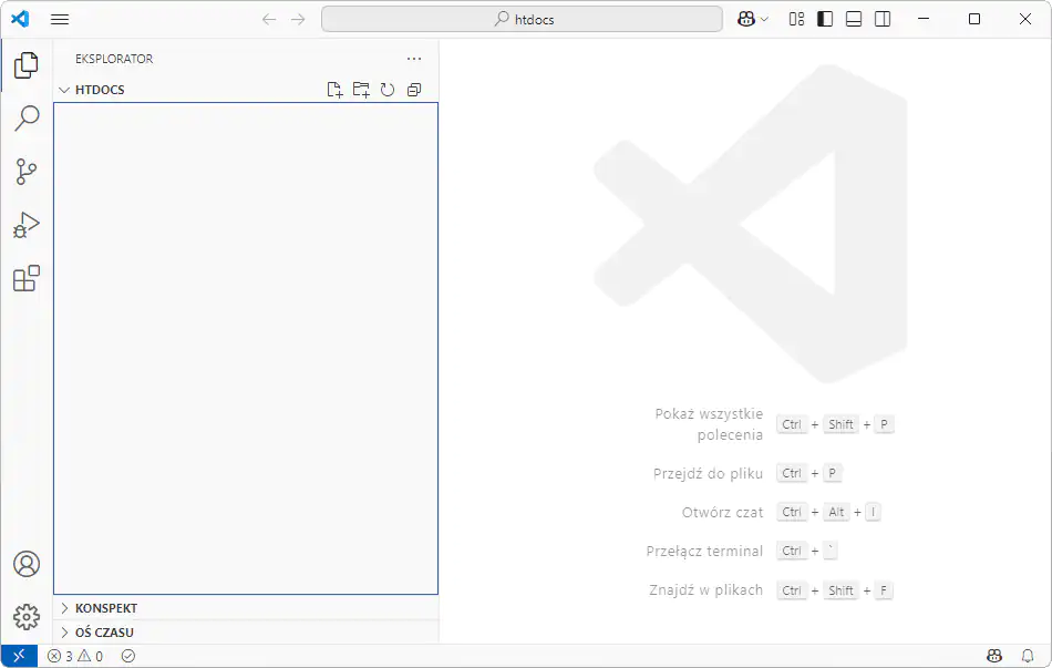 Jeśli go otworzysz, to znajdziesz w nim standardowy kilka domyślnych plików i folderów, które możesz usunąć, aby w ich miejsce umieścić swoje. Usuń więc całą zawartość folderu c:/xampp/htdocs, a następnie otwórz go w Visual Studio Code, aby uczynić go swoim folderem projektu. Okno główne programu powinno teraz wyglądać tak: