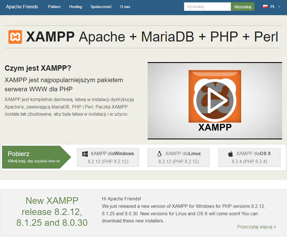 Aby zainstalować pakiet XAMPP na komputerze, najpierw musisz go pobrać z internetu. Wejdź więc na stronę https://www.apachefriends.org/pl/index.html i kliknij odpowiedni przycisk pobierania. Ja wybrałem XAMPP dla Windows 8.2.12 (PHP 8.2.12), ponieważ pracuję w systemie Windows 11 i obecnie jest to najnowsza wersja tego oprogramowania.